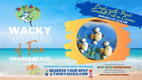 You have sent too many requests in a given amount of time. Request Headers: --> Art al Fresco at Tacky Jacks Orange Beach: Create-with-Paint, Seashell Fish on Canvas - Jan 13, 2026