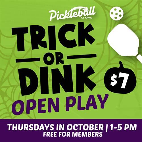 Get ready for a spooktacular time at Trick or Dink Open Play at Pickleball at OWA! Come celebrate the season with us every Thursday in October from 1:00 to 5:00 PM. Non-members play for $7, and members play free! Grab your BONES (paddles) and bring your ghostly crew for an afternoon of friendly competition. It’s the perfect way to enjoy the season!